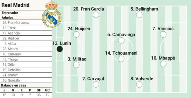 附阿斯展望皇马首发:13-卢宁、20-弗兰·加西亚、24-赫伊森、3-米利唐、2-卡瓦哈尔、6-卡马文加、14-琼阿梅尼、5-贝林厄姆、8-巴尔韦德、7-维尼修斯、10-姆巴佩