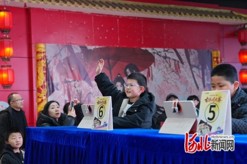 图为迁安市第二届诗词大赛少儿组决赛现场,小选手获取小组赛成功时向不雅众挥手致敬。张泽慧摄