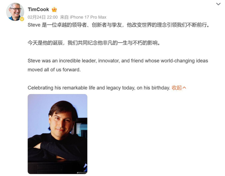 为此,库克@TimCook在微博发文担心乔布斯并记念他的生日。原文如下:Steve是一位特别的相易者、鼎新者与石友,他以改造天下的理念引颈咱们握住前行。今天是他的生日,咱们共同记念他特别的一世与不灭的影响。
