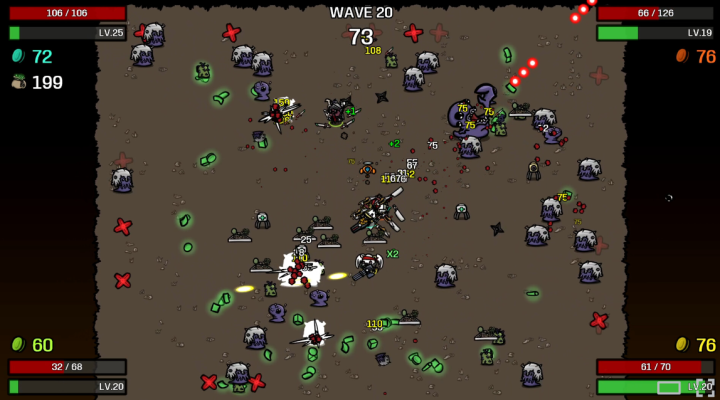 肉鸽游戏绕不开的经典之作(类吸血虫玩法),玩家操控花里胡梢被迫鉴别的土豆,在一波又一波的怪潮中存活升级,考取升级加成并购买说念具,组建家数,打败梗概撑过第20波的怪物就算顺利