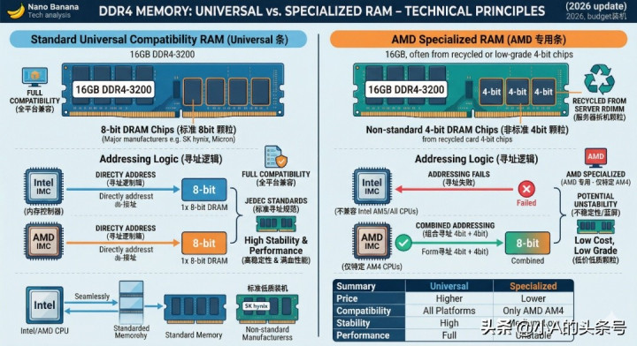好多小白在搜内存时,会看到有些居品标着“仅限 AMD 平台,Intel勿拍”(诚然也有反着来的)。或者会将“兼容条”“专用条”分开报价。