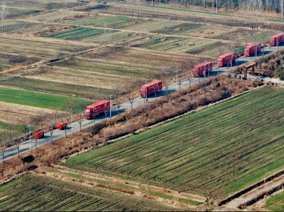 记者发现,在长达百米的送货车队中,两辆红色无人车分外显眼,为身后八辆9米6大货车“领航”。智能配送无人车名叫“独狼”,在复杂的乡村道路上自主规划路径、规避障碍,带领后方车队前行。通过京东APP搜索“京东小哥”,全国用户可直击从宿迁亚一发车到光明村的全流程。