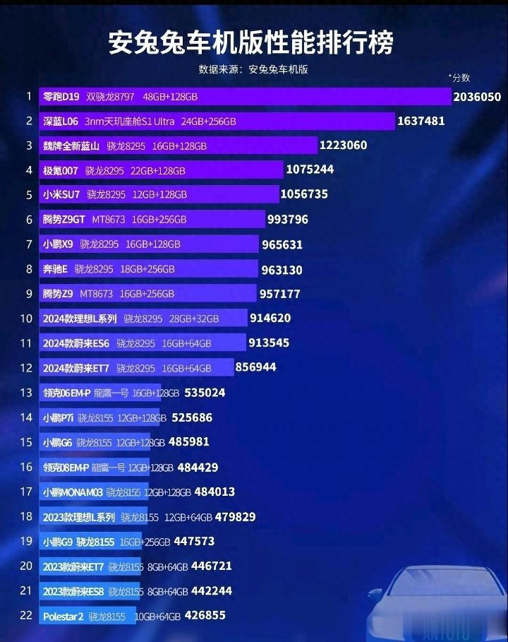 2026年4月8日,安兔兔车机版性能名次榜风雅发布。这份榜单基于实在用户诞生跑分数据,逃匿了再行势力到传统豪华品牌的22款主流车型,昭着地勾画出智能汽车座舱芯片的竞争形势。其中,零跑D19凭借双骁龙8797芯片组合,以2036050分的统共上风断层领跑,而深蓝L06搭载的3nm天玑座舱S1 Ultra则以1637481分位居次席,两者的发达不仅刷新了车机性能上限,也揭示了2026年智能座舱“算力为王”的中枢趋势。