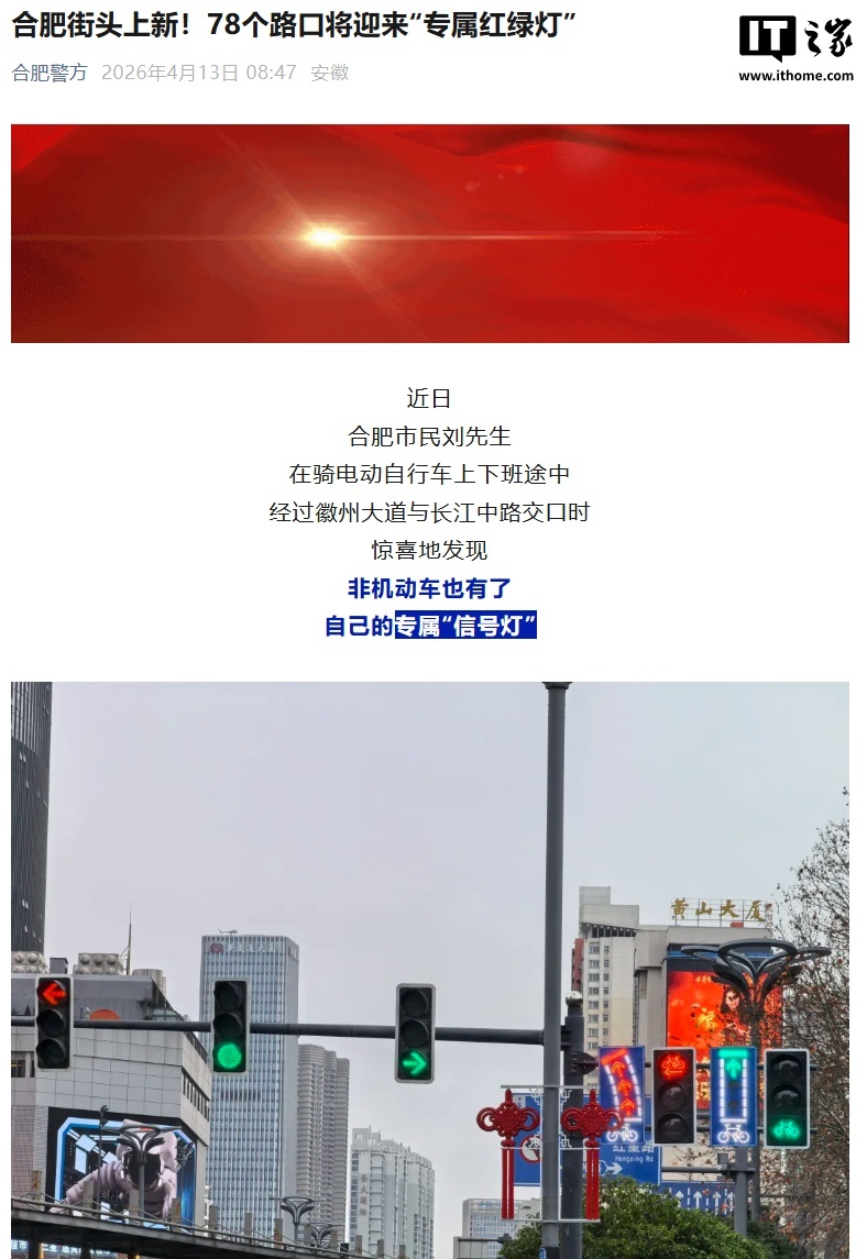 IT之家 4 月 13 日音书,据“合肥警方”官方本日音书,安徽合肥的部分路口推出了非生动车专属的“信号灯”。