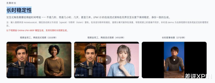 在对比视频里,最左边的 LPM-1.0 跟另外几个模子比较,生成时辰更长,连接性以及面部色彩齐愈加天然。