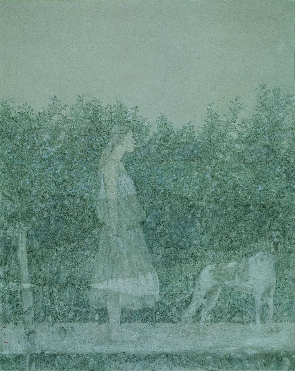 “工笔不应只是精细的描摹,它更需要呼吸和温度。”鲍莺在展览现场表示,“我尝试将写意的‘松’与‘活’融入工笔的‘精’与‘微’之中,让画面既有传统的底蕴,又能传达当代人细腻的情感体验。”这一理念在其《海上花》系列及全景式作品《郊野公园》中得到充分体现——传统没骨法与西方光影结构悄然融合,色彩淡雅而层次丰富,在朦胧中透出诗意的微光。