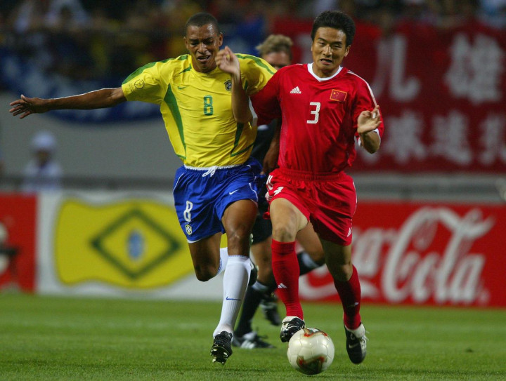 2002年韩日天下杯草创了合办天下杯的先河。图为天下杯上中国队杨璞与巴西队吉尔伯托·席尔瓦拼抢球权。图片