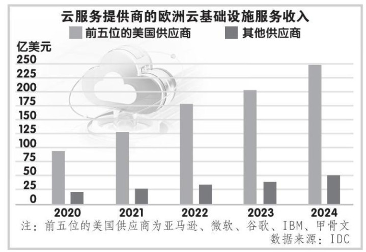 2024年,欧洲客户在五大美国云服务商的基础设施服务上支出了近250亿美元,占欧洲市场总额的83%。欧盟在计算机服务领域对美国的贸易逆差接近1500亿欧元。