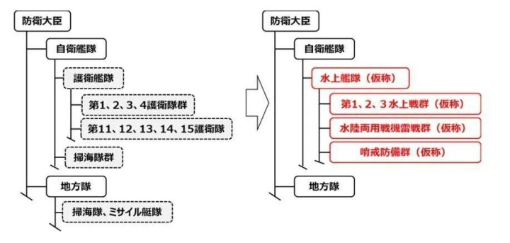 左证新的编制,第1水上战群的司令部设在横须贺,“出云”号直升机航母(DDH-183)担任旗舰;第2水上战群的司令部设在吴港,“加贺”号直升机航母(DDH-184)担任旗舰;第3水上战群的司令部设在舞鹤,“日向”号直升机航母(DDH-181)担任旗舰。