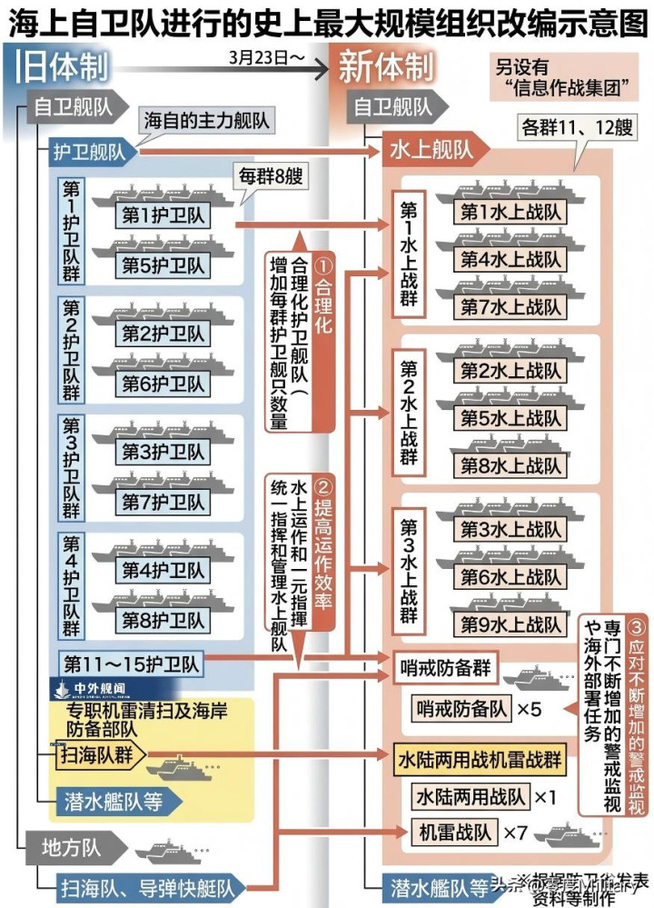 2026年3月23日,日本海上自保队认真闭幕了历史悠久的“护卫舰队”体系,被新组建的“水上舰队”改朝换姓,这是自1954年以来边界最大的一次组织架构鼎新。
