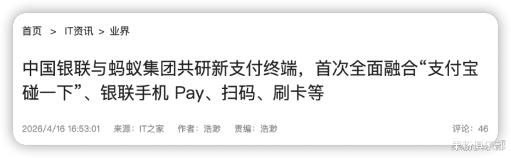 4 月 16 日,中国银联与蚂探究团共同晓谕,两边已结束生态共建配合。