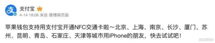 4 月 14 日,支付宝官刚直式晓谕,苹果钱包现已守旧通过支付宝径直灵通 NFC 交通卡。