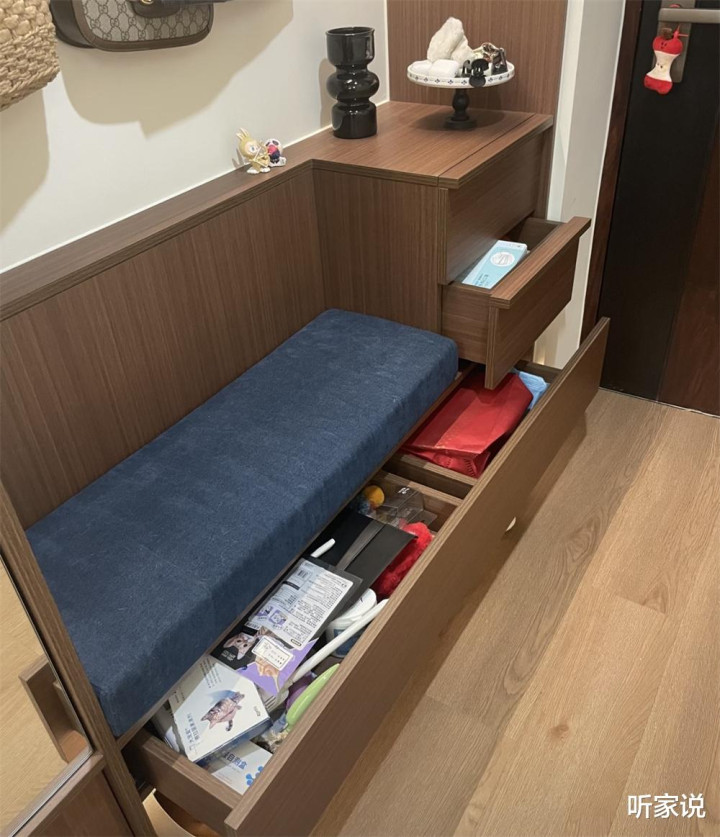 一开始本以为家里用不着换鞋凳,有做换鞋凳的空间,还不如多留给玄关柜做些收纳,但当我真正每天在玄关换鞋都要蹲着,还有一次没蹲稳一屁股坐在地上后,我发现换鞋凳的重要性。