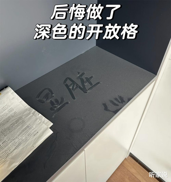 我所在的北方城市,灰尘真的比较大,开放柜没几天就会覆盖上厚厚一层尘土,浅色的柜子还看不出来,但深色的柜板真的太明显,我从一开始三天擦一次,到后面一周再到放弃,总共也就坚持了俩月,实在是没那么多时间每天把柜子都擦一遍。