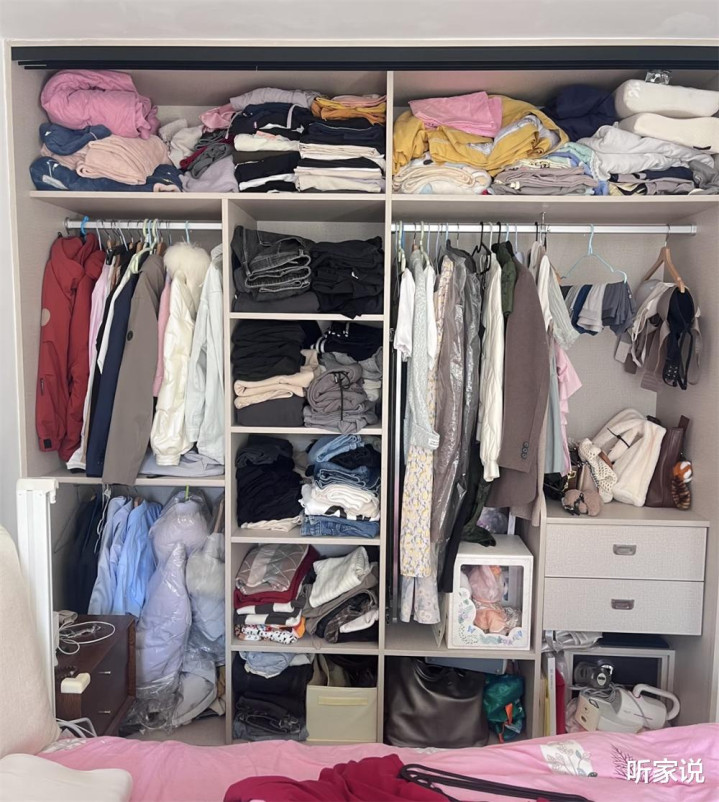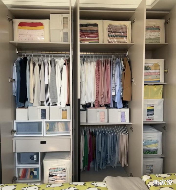 如果家里挂衣区少,叠放格多,可以买点那种硬质的抽屉盒填充隔层,叠好或压根不叠的衣服塞到里面推进去,明面上依旧不会显乱;不常穿的或者换季衣物,则装个防尘袋(别买无纺布的),放在衣柜最高处,不经常拿取也不会觉得不方便。