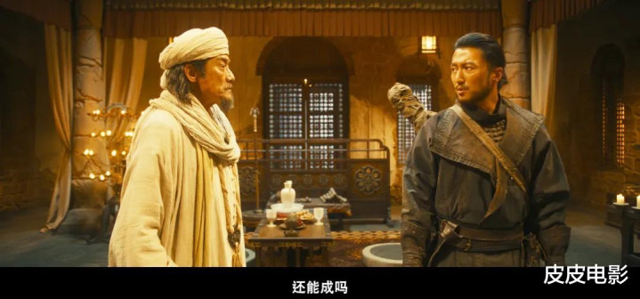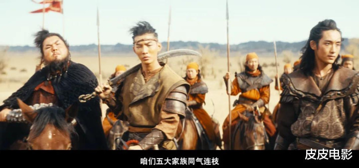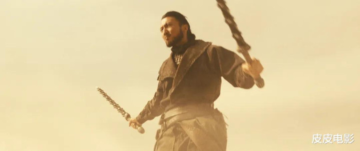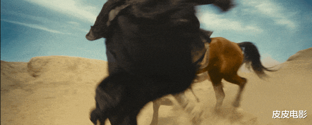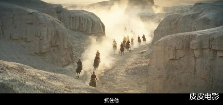 紧接着等于马上追赶战,几匹骏马在黄沙中决骤,演员们在马背上挥刀格挡、翻身规避,马蹄扬起的尘土和刀光剑影交汇在通盘。